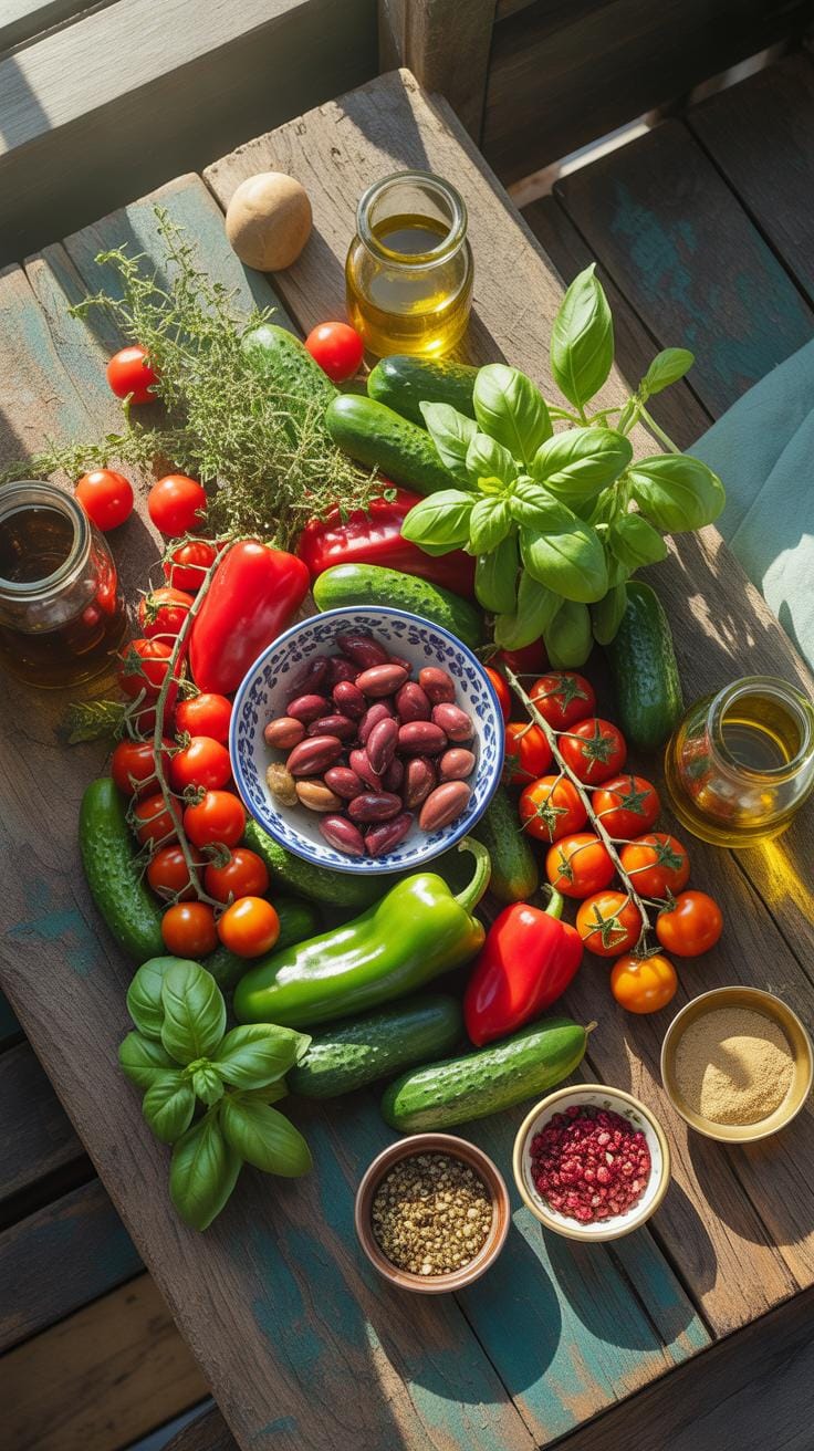 - Fresh vegetables: tomatoes, cucumbers, bell peppers, spinach, eggplant, zucchini